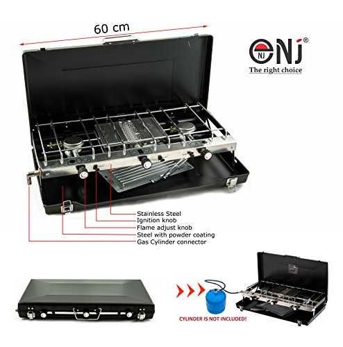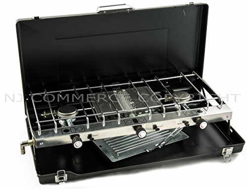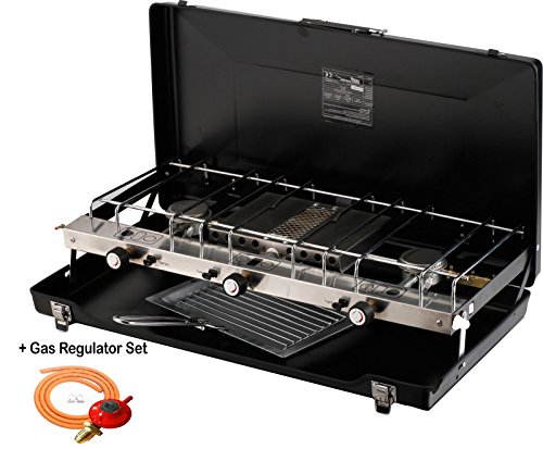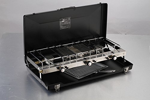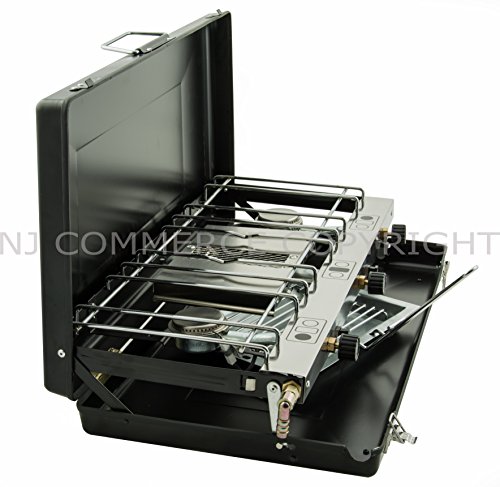 All images of Foldable Double Gas Stove 2 Burner Camping Outdoor Dual Use Cooker Grill Case NEW