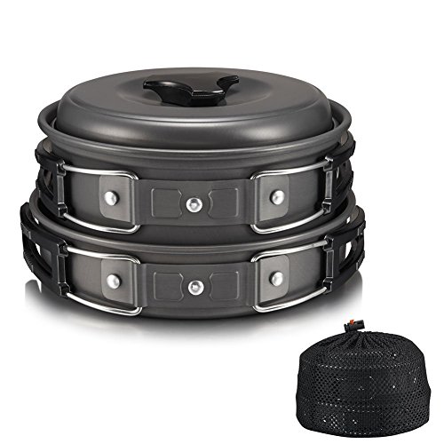 Portable Camping Cookware Backpacking Cooking Kit by AIQI, 8 Piece Hiking Outdoors Bug Out Bag Cooking Equipment, Lightweight, Compact, Durable Pot Pan Bowls with Nylon Bag